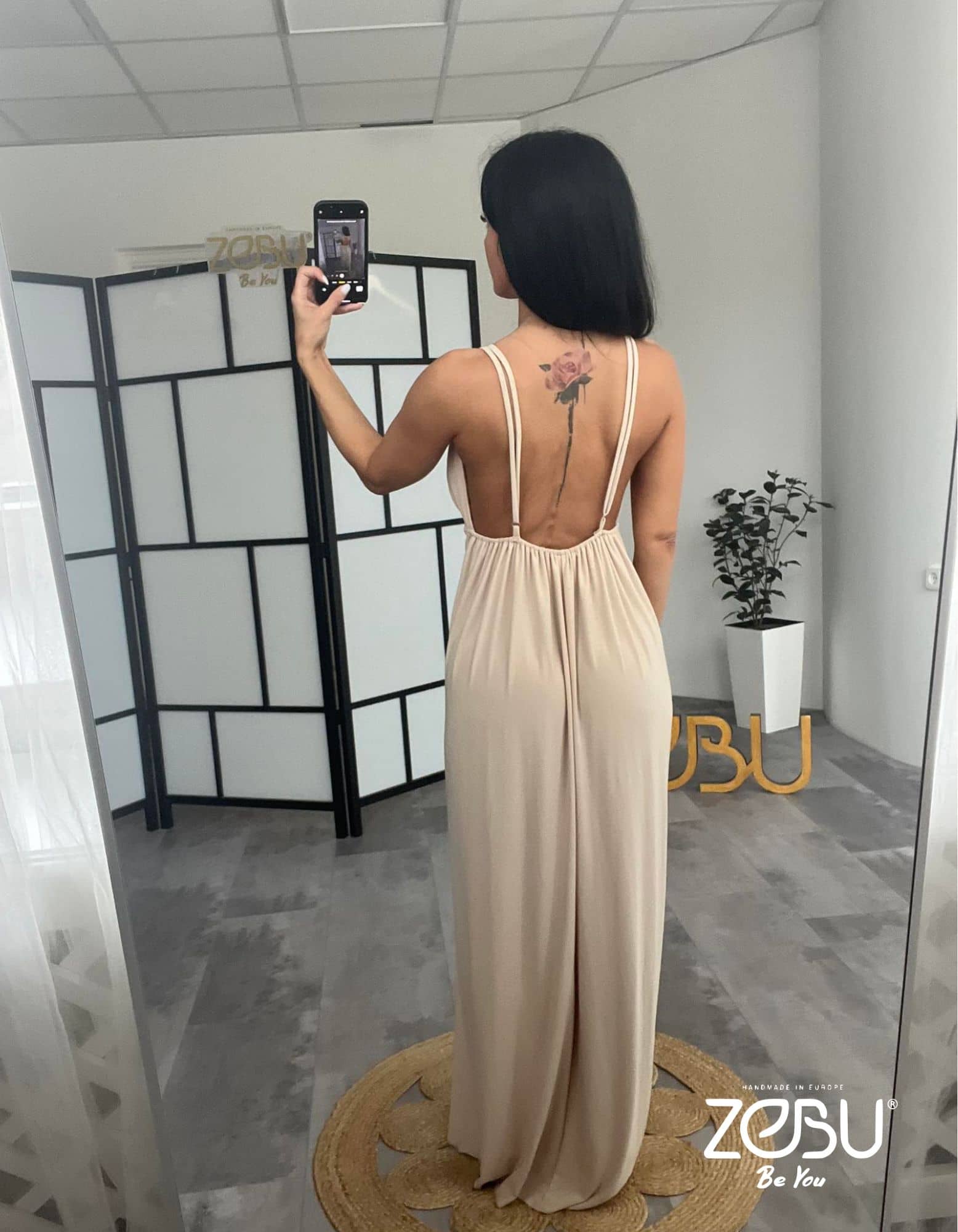 Ruha kialakítása V-nyakkivágású felsőrész, deréknál behúzással; hosszú, földig érő, oldalt felvágott szoknyarésszel. Anyaga Jersey, amely nem áttetsző;