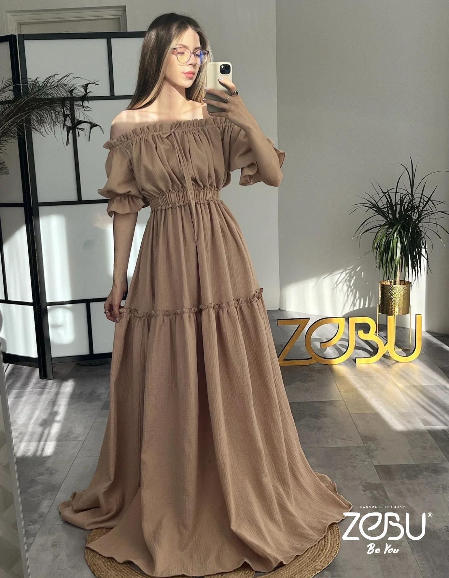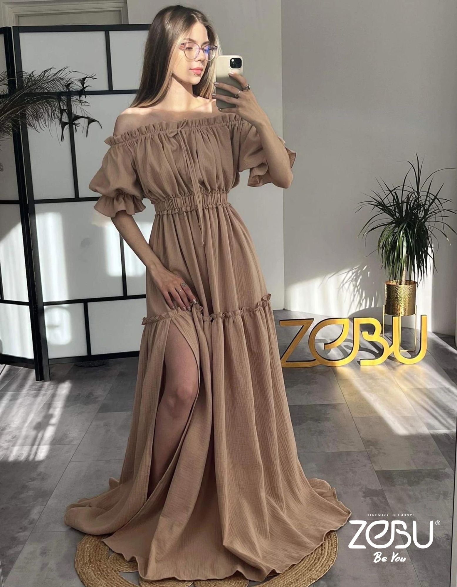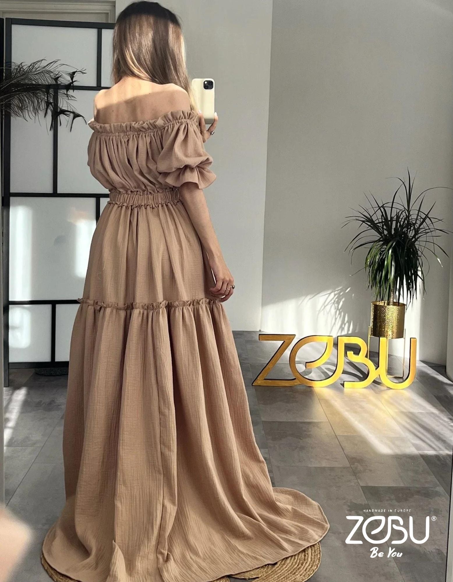 Emelje ki eleganciáját lenyűgöző földig érő ruhánkkal, melyet magasan sliccelt és váll nélküli kialakítással terveztünk. A nyakkivágáson dekoratív fodrokkal és kivételes félhosszú ujjakkal, rugalmas derékkal, bájt és kényelmet sugároz laza szabásának köszönhetően.