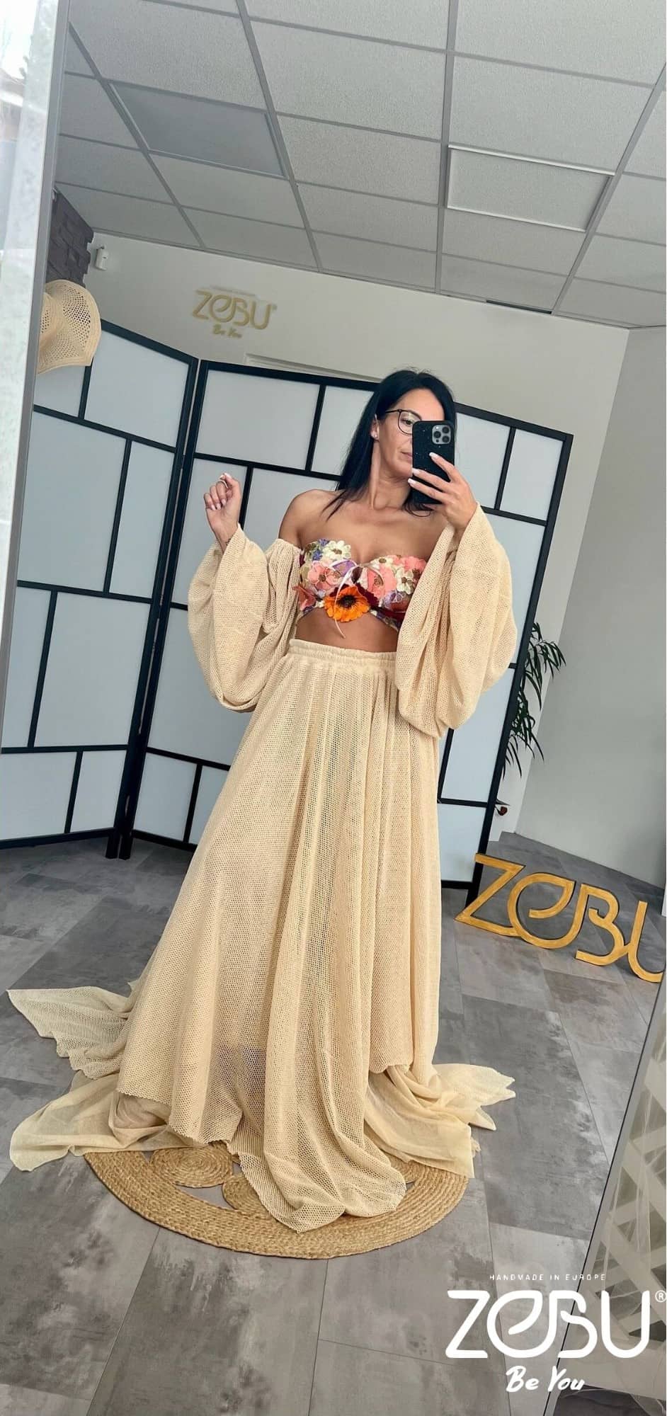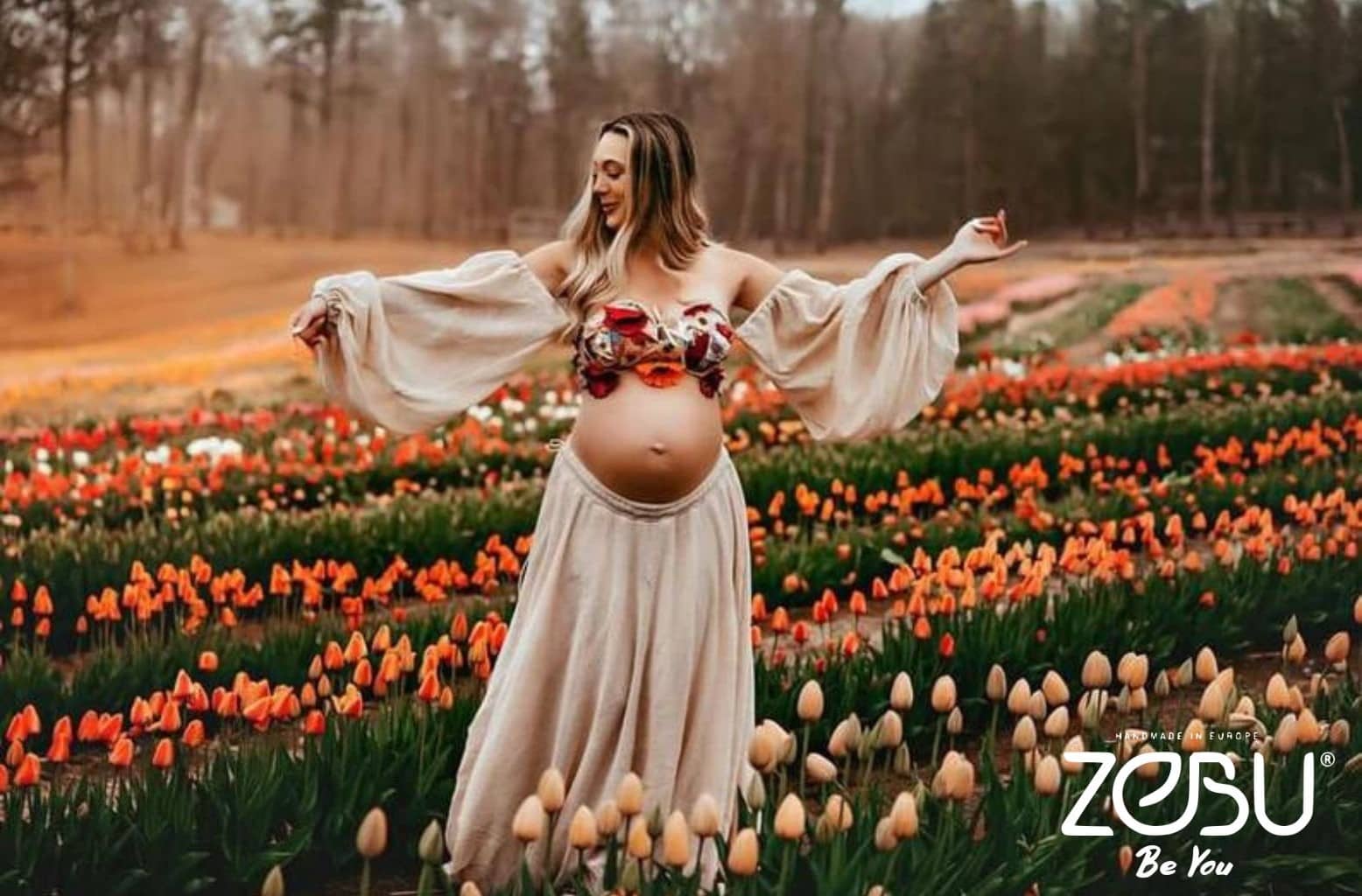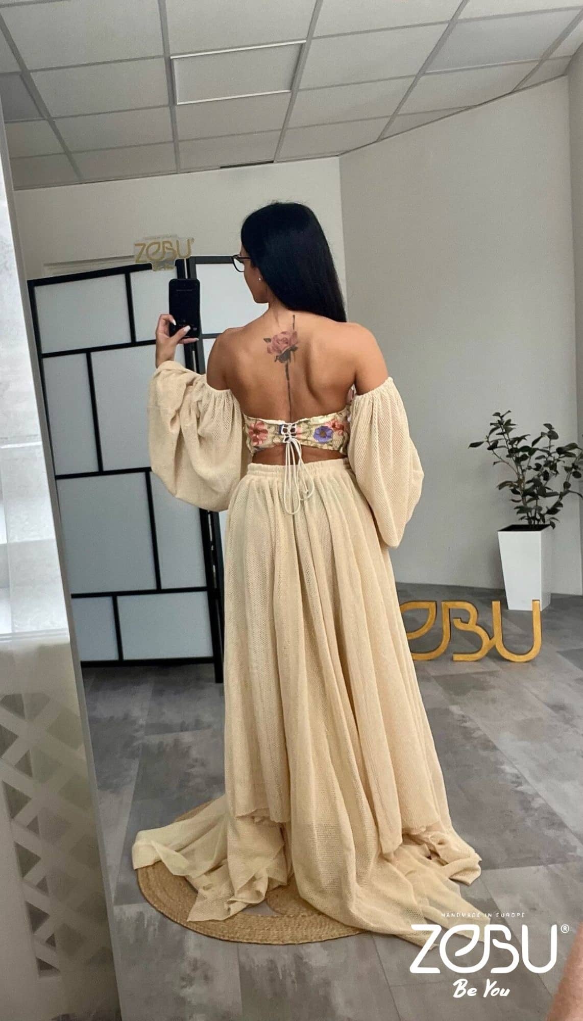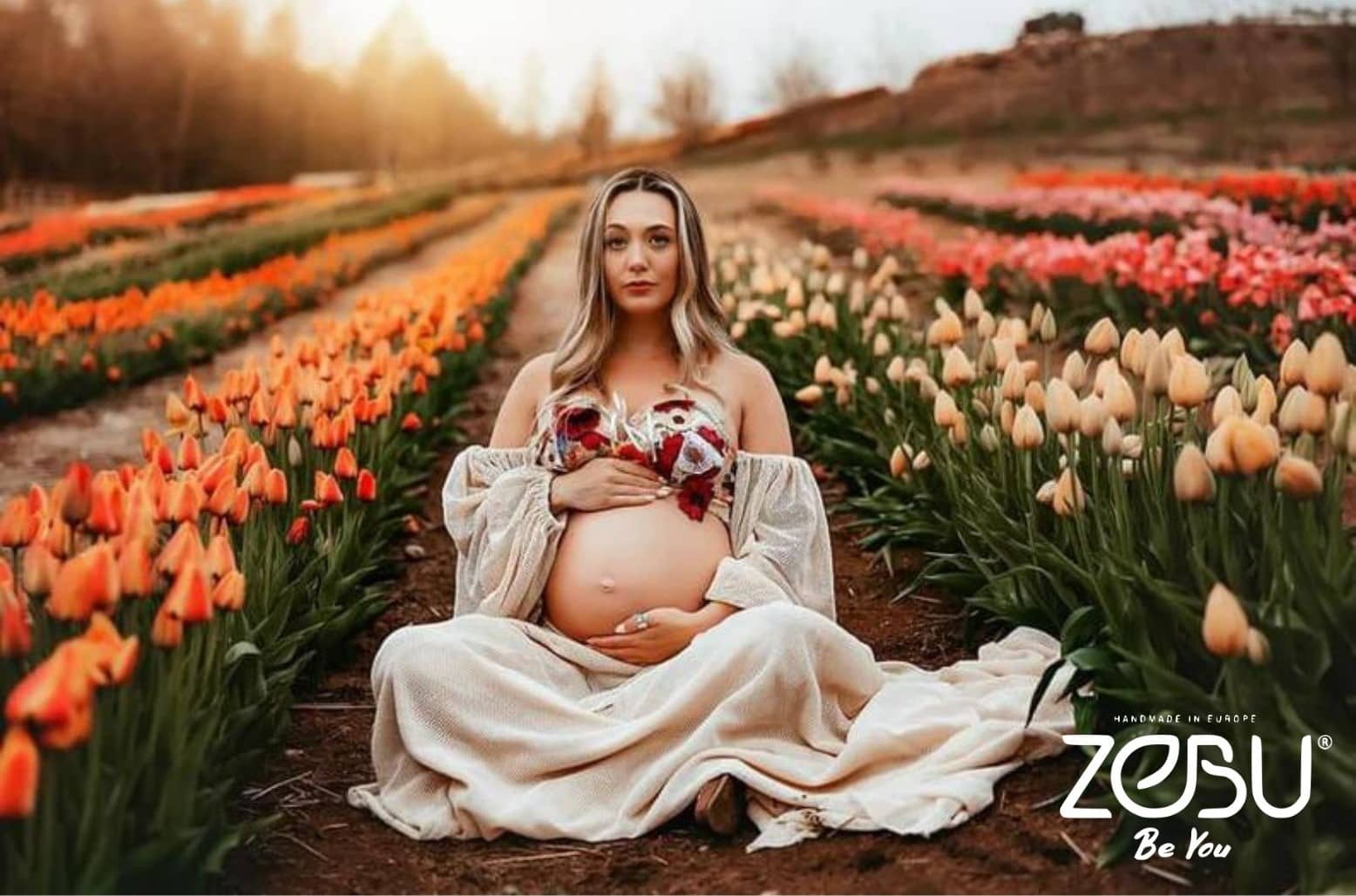 Bemutatjuk Aura ruhánkat – Felsőrészét 3D-s virágok díszítik, bő ujjakkal, elöl megkötővel és hátul könnyen állítható fűzővel terveztük. Az alsórész dupla rétegű organikus pamutból készült, légies szoknyarésszel, így tökéletes választás kismama fotózásokhoz, biztosítva, hogy a fotózások során is kényelmesen érezze magát.