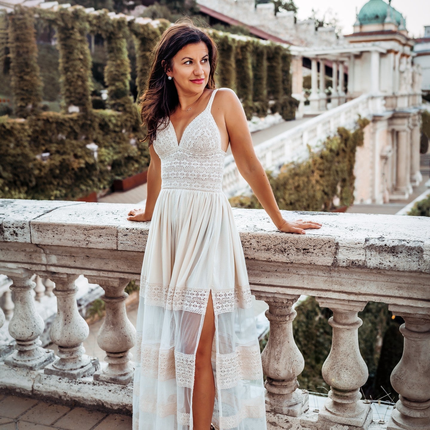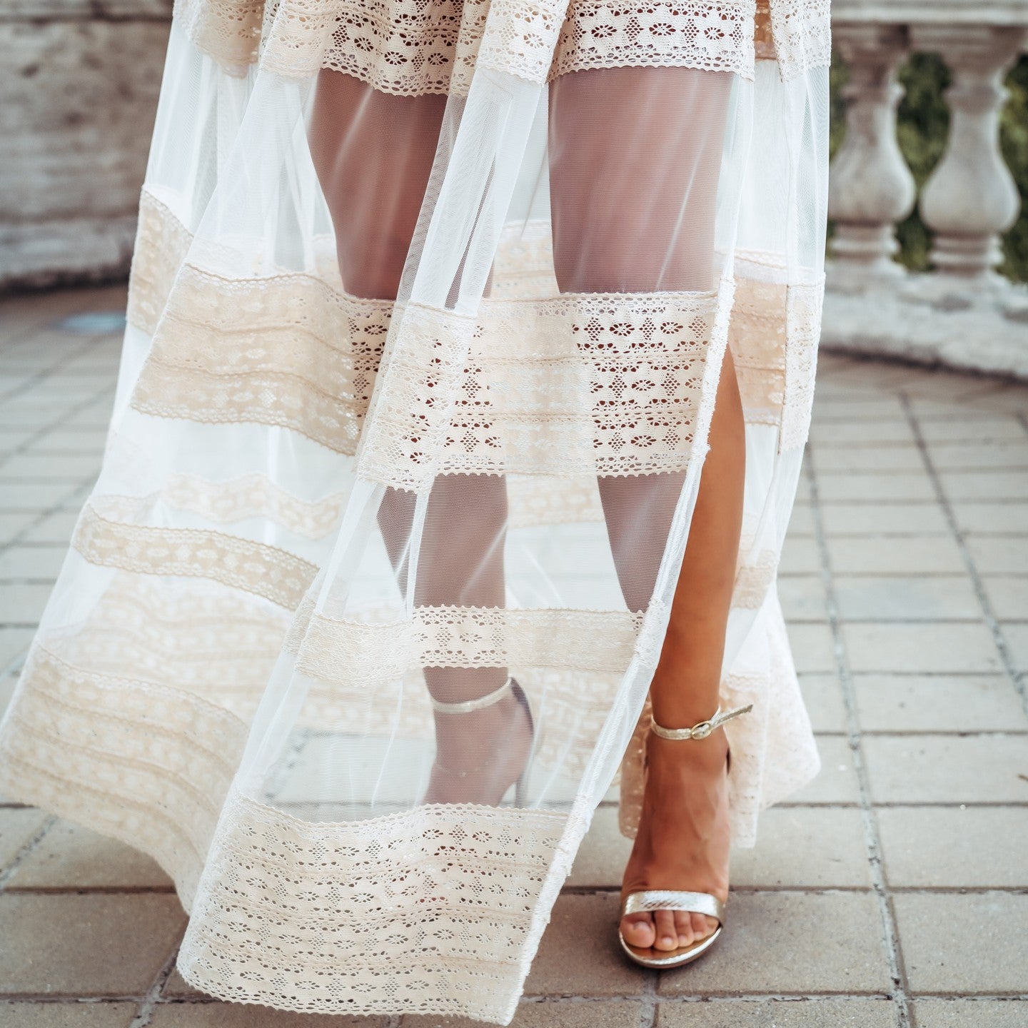 A szoknya puha tüllből készült, és combközépig bélelt, ettől lefelé áttetsző, amit a felsőrészhez használt csipke díszít, fokozva a romantikus és légies megjelenést. A hátul nyitott, fűzős kialakítás biztosítja a tökéletes illeszkedést, miközben a fűző diszkréten takarja a hátrészt.