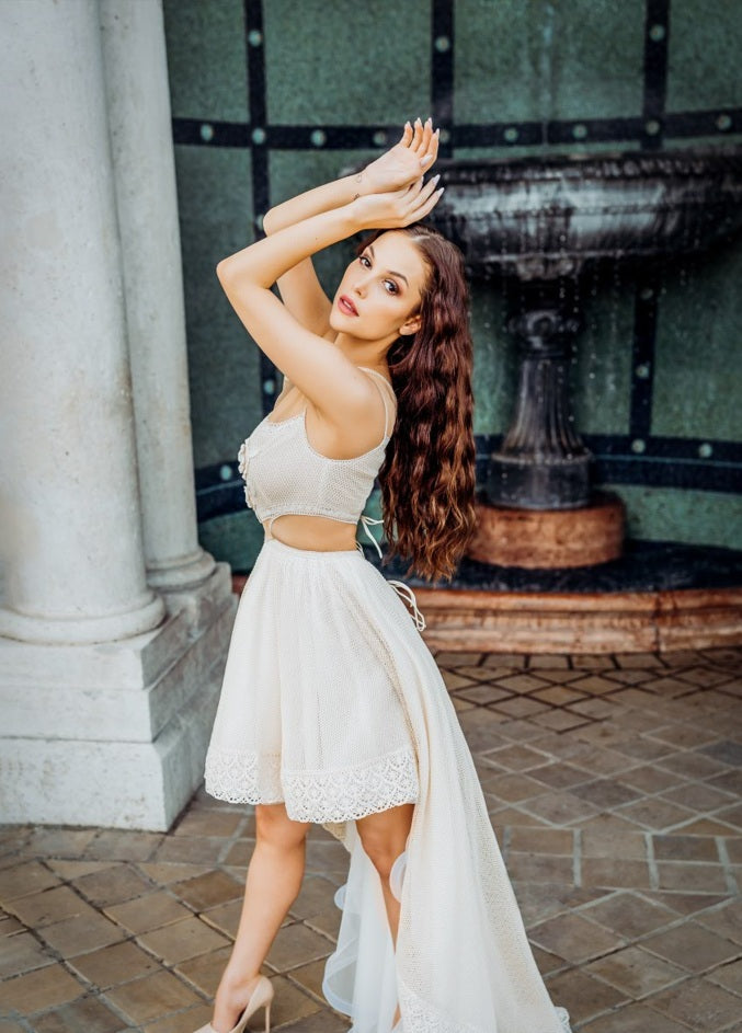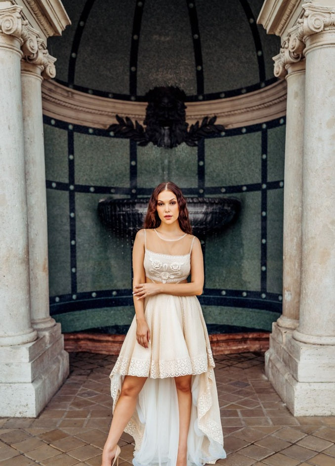 Top-Felső Rész: Teljes egészében finom csipkéből készült, amely alatt pamut-lyukacsos anyag szolgál bélésként. A dekoltázs vonalán, a top alján és a hátrészen vékony szélcsipke díszíti a ruhát, amely lágyan fokozza a nőies megjelenést. A hátul gyöngyházfényű gombokkal záródó felsőrész enyhén átlátszó, elegáns és különleges hatást kelt.