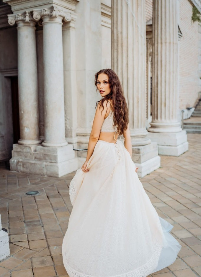 Szoknya: A felsőrészhez hasonlóan a szoknya is teljesen csipkéből készült, pamut-lyukacsos béléssel. A szoknya uszálya puha tüllből áll, négy rétegben, amely könnyed lebegést és légies mozgást biztosít. Az uszály nem levehető, hátul szintén gyöngyházfényű gombokkal záródik. A csipkés szoknya enyhén átlátszó, amely romantikus és sejtelmes megjelenést ad ennek az egyedülálló darabnak.