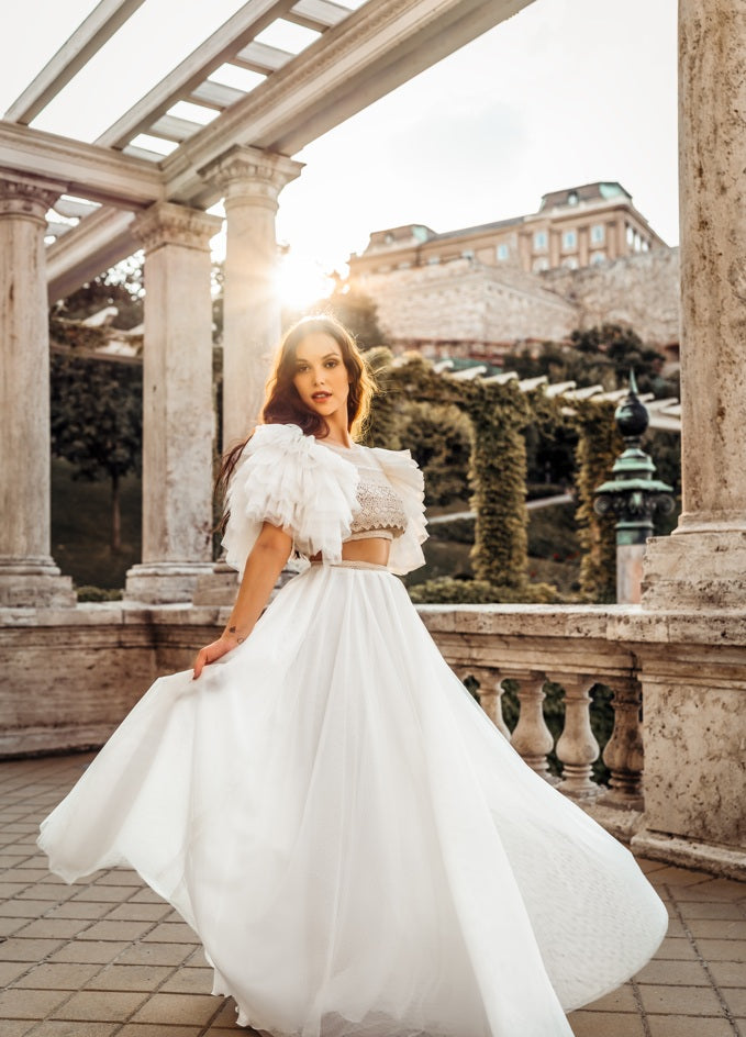 Szoknya: A szoknya több rétegű tüllből készült, amely a légies esést és a gazdag textúrát biztosítja. Az első három réteg puha tüll, alatta egy kemény tüll réteg található, amely extra volument és tartást ad a szoknyának. Az alsószoknya selyemből készült, amely még elegánsabbá teszi az öltözetet. A derékpánt szélcsipkével van díszítve, amely harmonikusan illeszkedik a felsőrészhez. A hátul található fűző lehetőséget biztosít a pontosabb igazításra, így a szoknya tökéletesen illeszkedik a testhez. /A fűzők maximum egy méretkülönbségnek megfelelően állíthatóak. /