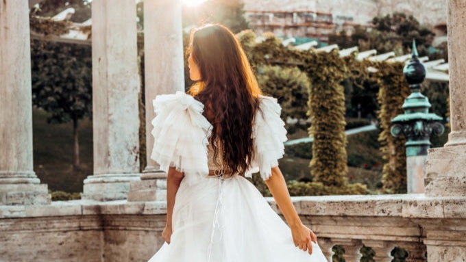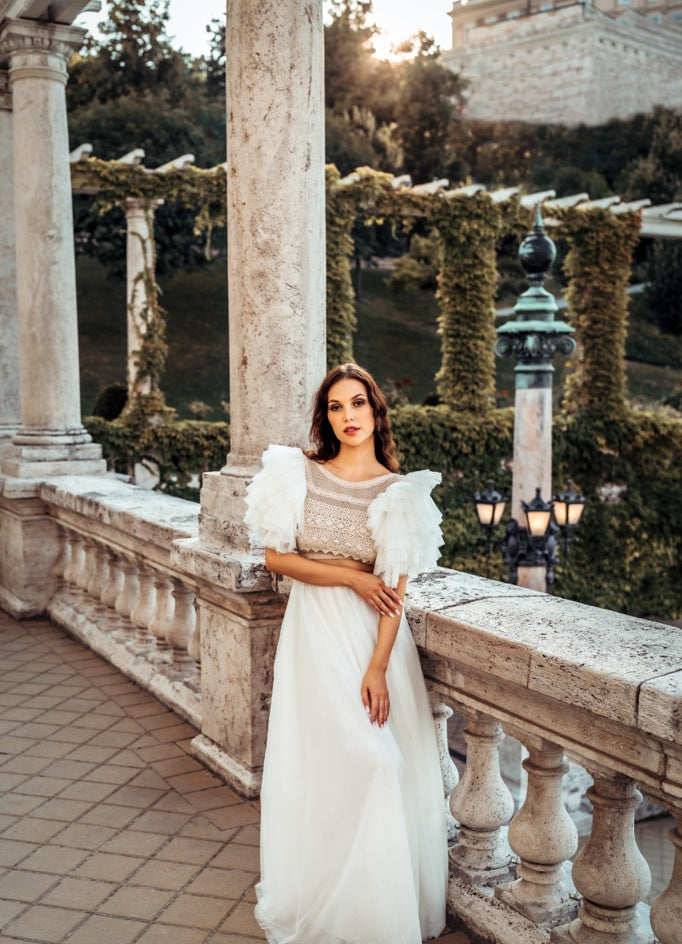 Top-Felső Rész: A felsőrész puha lyukacsos pamutból készült, melyet mellrészén széles szélcsipke díszít. A bő fazonú ujjak több rétegű, fodros puha tüllből készültek, amelyek légies és romantikus hatást kölcsönöznek a ruhának. A nyakkivágás és az alsó szegély keskeny szélcsipkével van díszítve, amely a finom részletek iránti figyelmet tükrözi. A hátán található fűző lehetővé teszi a ruha méretének egy maximális méretkülönbséggel való igazítását, így biztosítva a tökéletes illeszkedést.