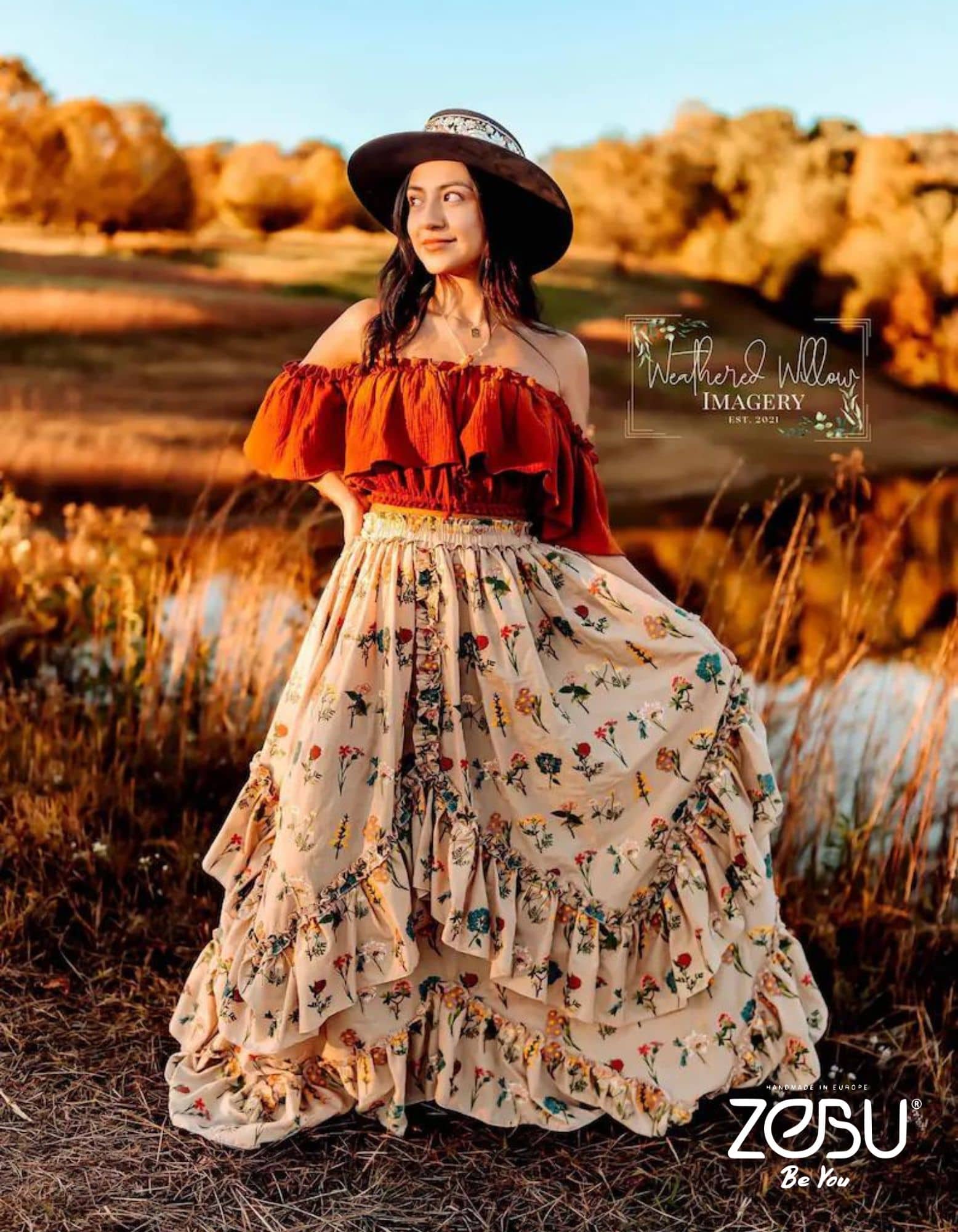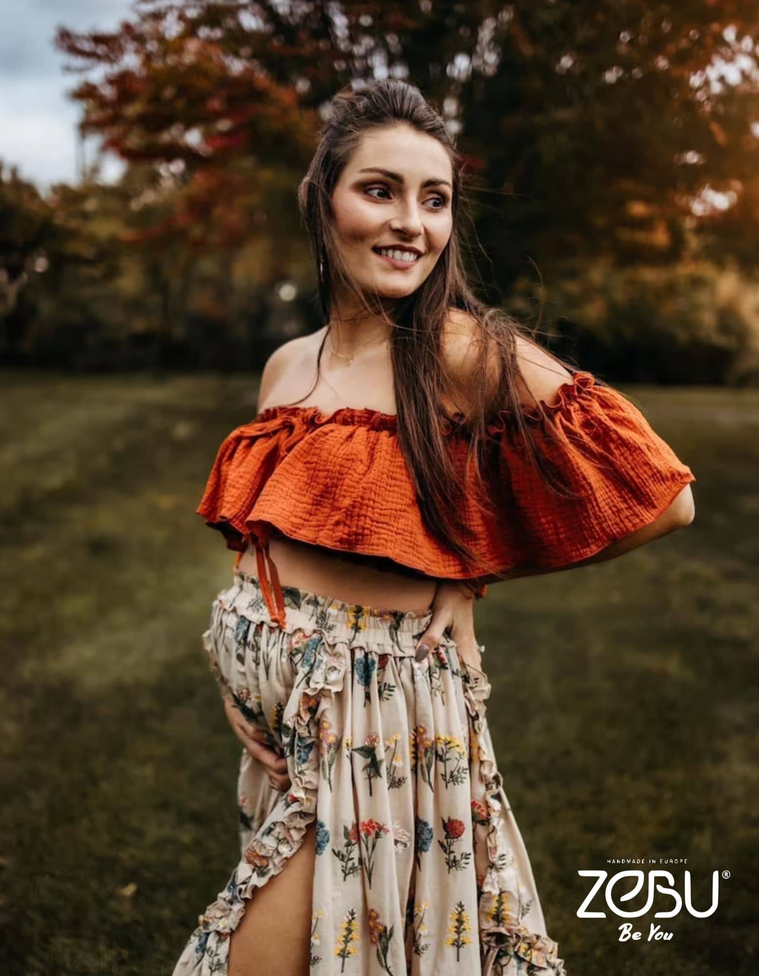 Dupla géz felső fodros részletekkel, a váll nélküli stílus kedvelőinek. Organikus lenvászon szoknya virágmintákkal díszítve, magas felvágással.