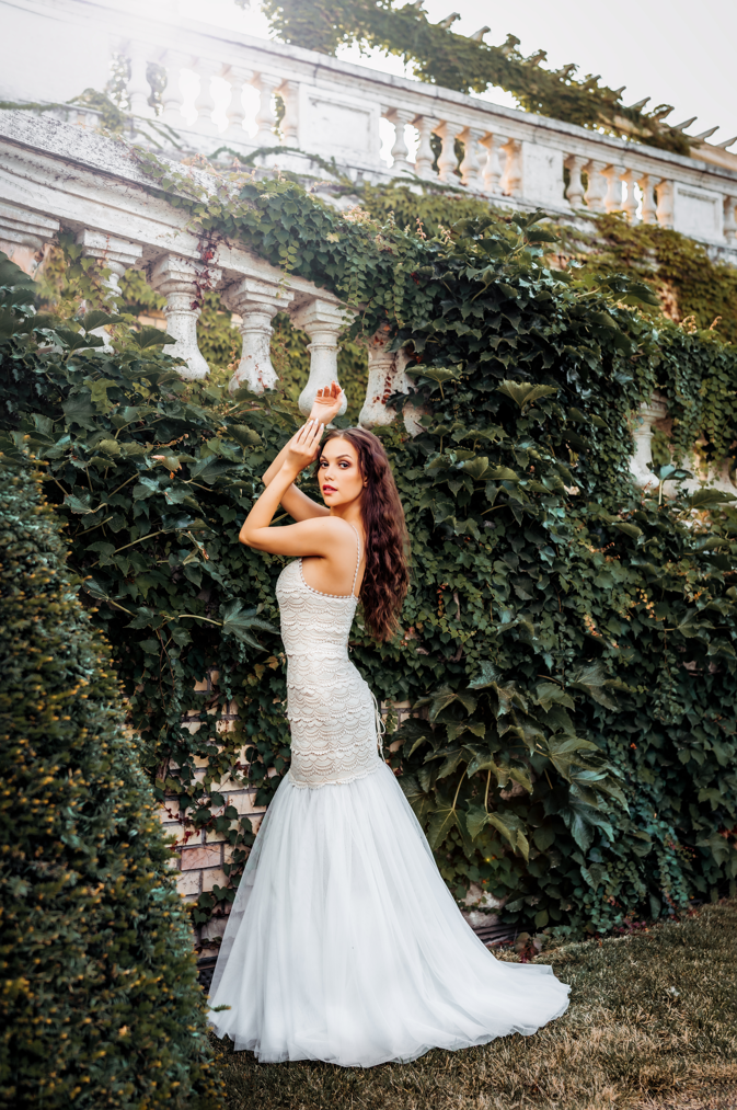 Ez az egyrészes, sellő fazonú, combközépig csipke, alja tüll, eleganciájával és nőiességével elbűvöl mindenkit. A bőrbarát tüllel bélelt anyag kényelmes viseletet biztosít, míg a hátul található fűző lehetővé teszi a tökéletes illeszkedést.