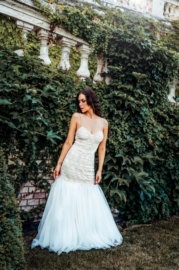 Alul a csipke részt folytatva öt réteg puha tüllből készült alsó réteg található, amely lágyan hullámzik, és enyhe uszályos hatást kelt. A válpántok 1 cm széles csipkéből készültek, amelyek finoman keretezik a dekoltázst.