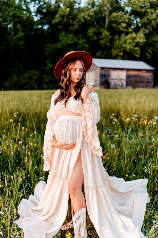 Éld át a bohém életérzést a Sakira szettünkkel, amelyet lenyűgöző kismama fotózásokra terveztünk. Ez a maxi ruha, amelyet a kismamák számára alkottunk, finom bájt sugároz, sokoldalú és elegáns öltözéket kínálva, amely a bohém stílusban emeli ki az anyaság szépségét.