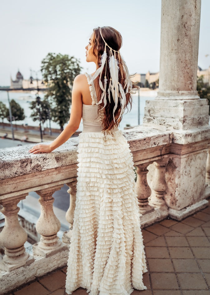 Ez a ruha a bohém szabadságot ötvözi a romantikus eleganciával – a tökéletes választás azoknak a menyasszonyoknak, akik szeretnék, ha megjelenésük egyediséget és természetességet sugározna.